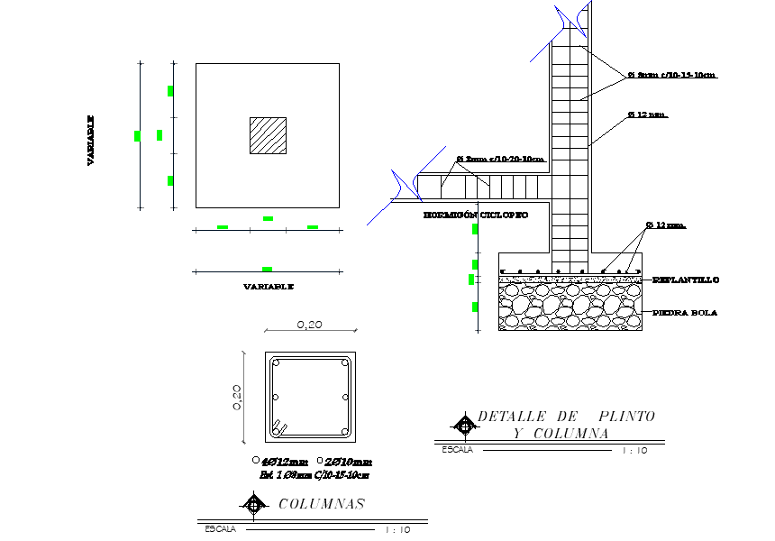 Column and foundation section plan autocad file, reinforcement detail, bolt nut detail, scale 1:10 detail, dimension detail, naming detail, stone detail, etc.