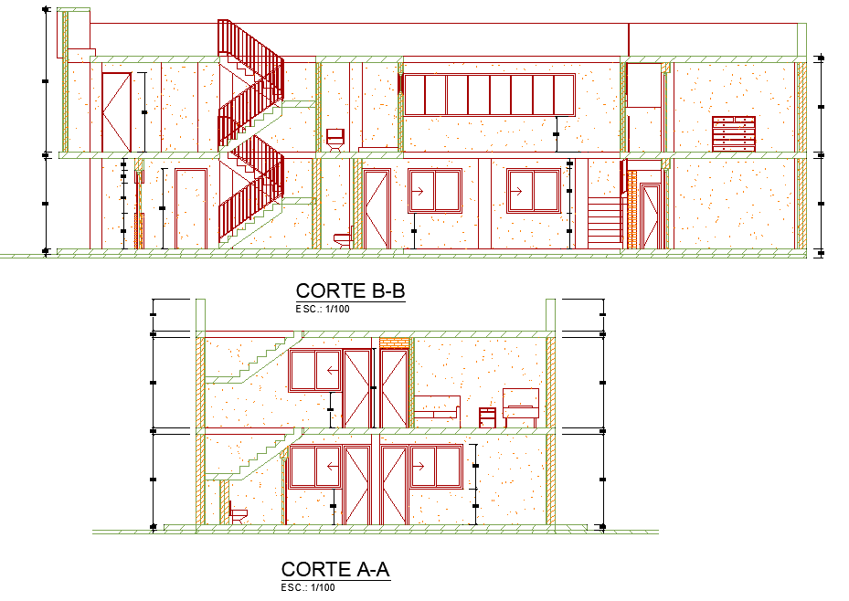 Section full house family housing plan autocad file, section A-A’ detail, section B-B’ detail, dimension detail, naming detail, furniture detail in table, chair, cub board door and window detail, stair detail, etc.