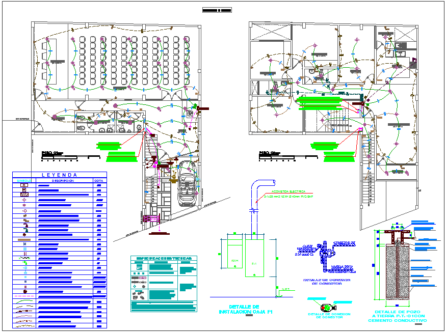 Lighting installation first and second floor plan for housing design dwg file in plan with view of area view of house with wall view and electrical line view with its connection and joint with its legend view and view of distribution board of electrical system with necessary detail.