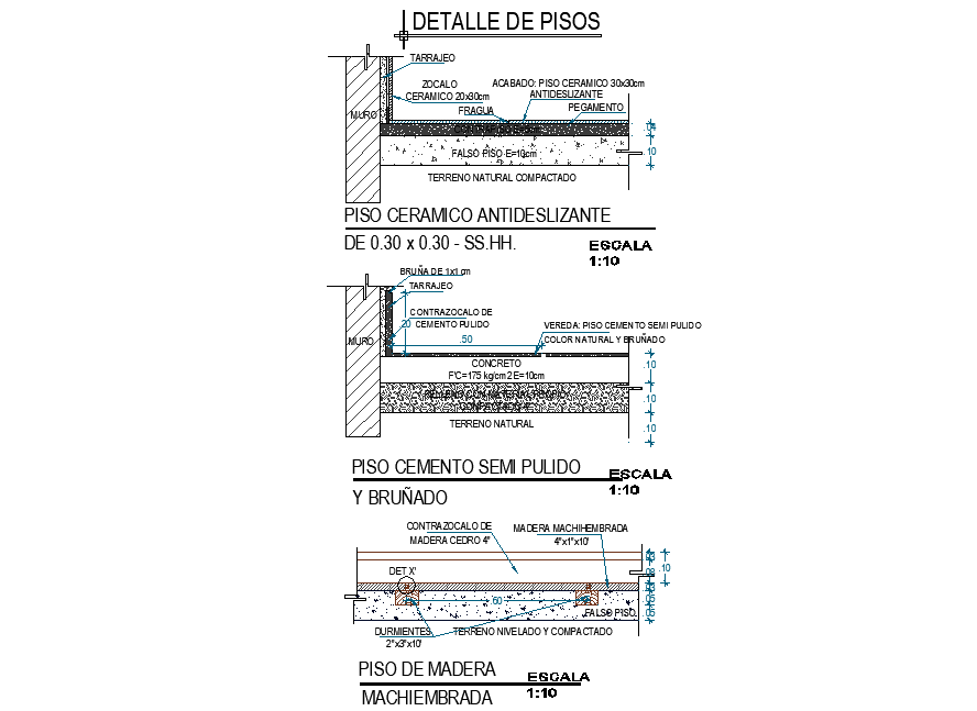 Floors detail dwg file, scale 1:10 detail, dimension detail, naming detail, concert mortar detail, 0.30 x 0.30 box detail, etc.