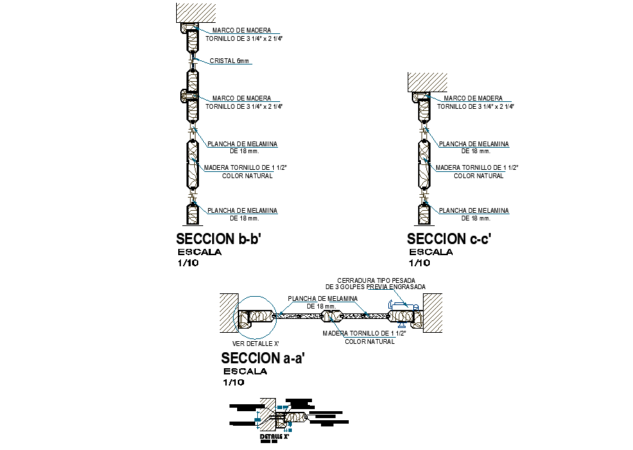 Section door detail autocad file, section A-A’ detail, section B-B’ detail, section C-C’ detail, scale 1:10 detail, naming detail, dimension detail, etc.