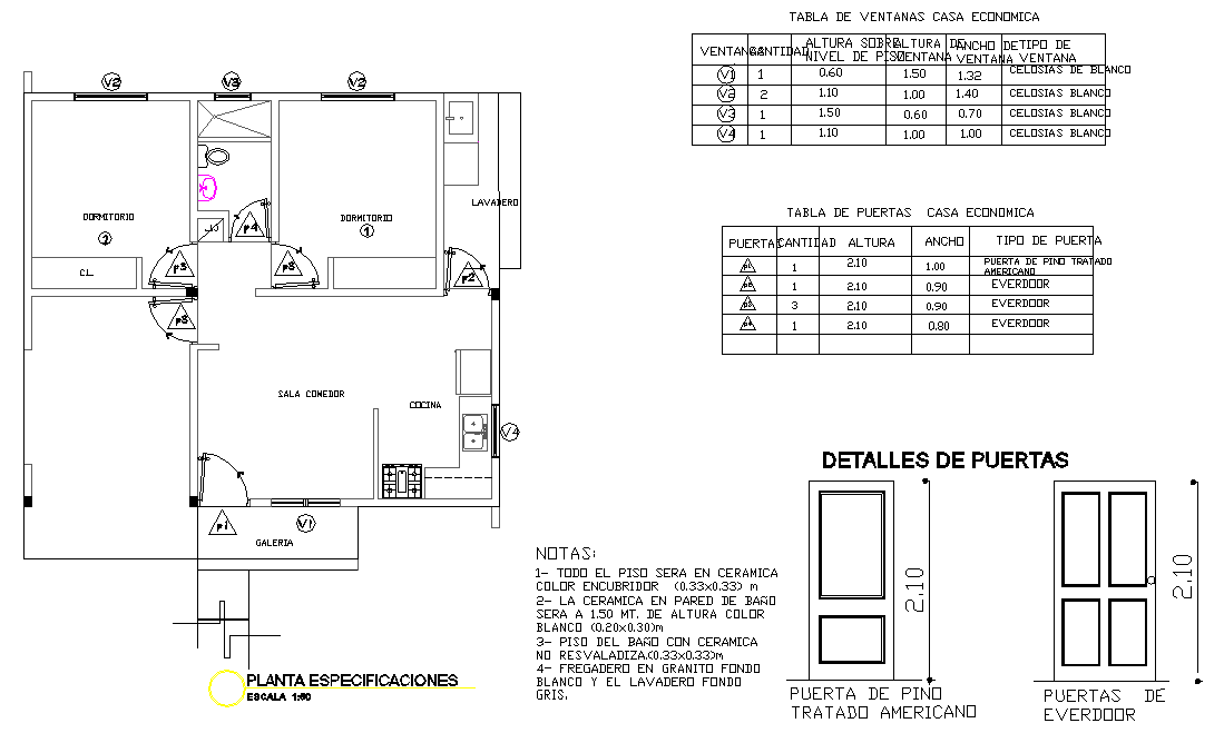 Door plan and elevation layout file, door and window numbering detail, dimension detail, naming detail, scale 1:50 detail, specification detail, table vent detail, etc.