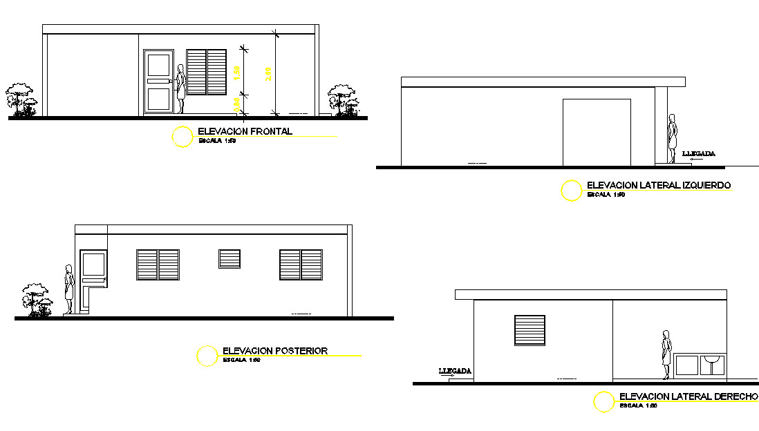 Elevation Afford able housing plan autocad file, front elevation detail, right elevation detail, left elevation detail, back elevation detail, scale 1:50detail, dimension detail, naming detail, leveling detail, furniture detail in door and window detail, etc.