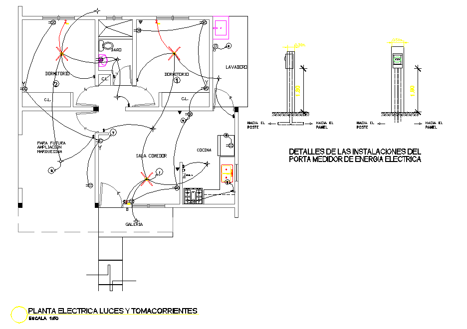 Electrical house plan detail layout file, dimension detail, naming detail, scale 1:50 detail, cut out detail, furniture detail in door and window detail, etc.