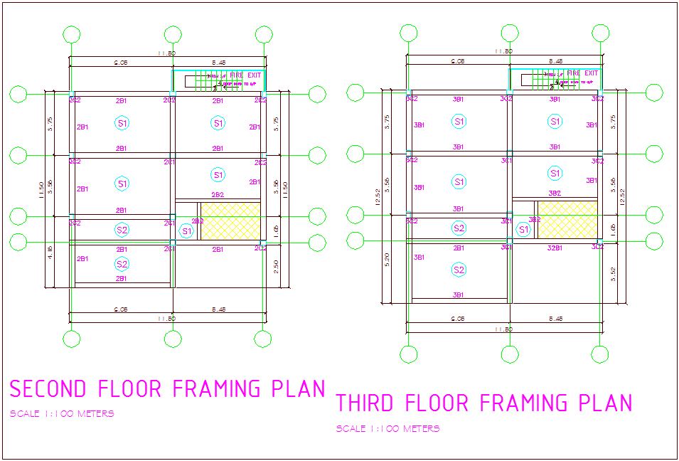 Framing plan with second and third floor plan of office area dwg file in second floor plan with view of area distribution and view of wall,wall support and slab view and view of fire exit area view and same view in third floor plan with necessary dimension.