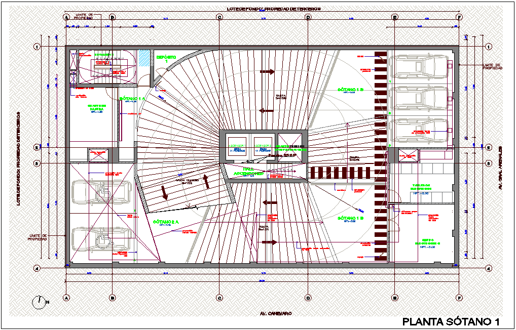 Basement floor one for office dwg file in first basement floor plan with view of area distribution with wall view and wall and wall support view and parking area view with car view and in-out way view and lot area of vehicle parking,ramp,way view with lift and necessary dimension.