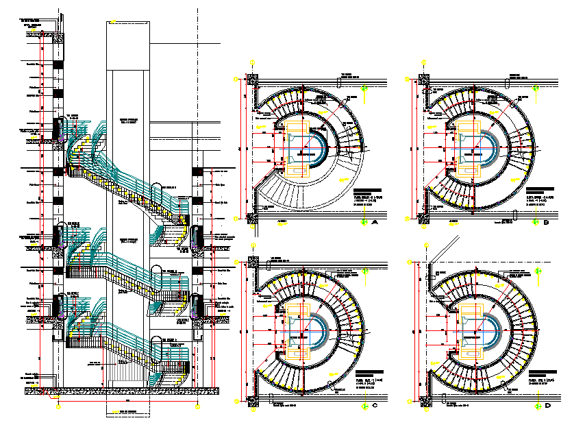 Round Shape Stair Design in DWG file. Gualdera in concrete, veneered in white marble, White marble floor, curved protection glass h = 1.80, panoramic lift, Steel handrails 2 "stainless, Structural plate in concrete etc detail.