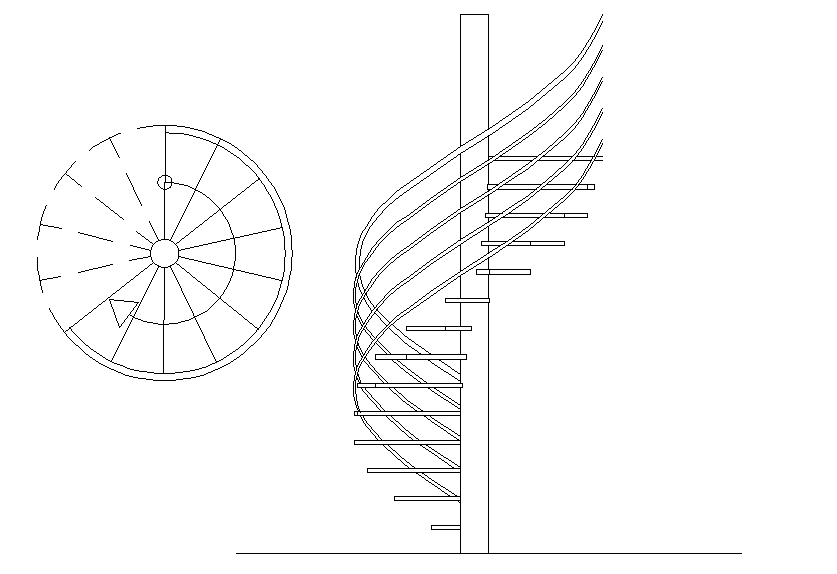Spiral stair plan and section layout file, hand rail detail, hidden line detail, riser and trade detail, etc.