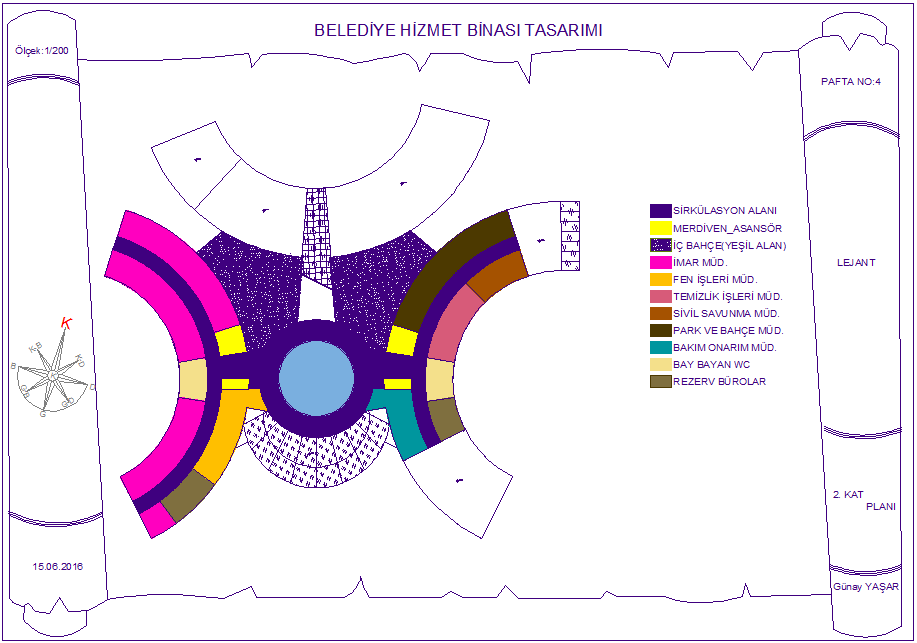 Distribution fourth floor plan of municipal building with color code dwg file in plan with view of park,