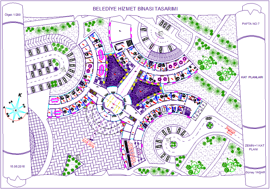 Municipal building floor plan number seven with architectural view dwg file in plan with view of area distribution and view of tree view and parking area and view of office and washing area and seating area view designer flooring view with pavement with necessary view.