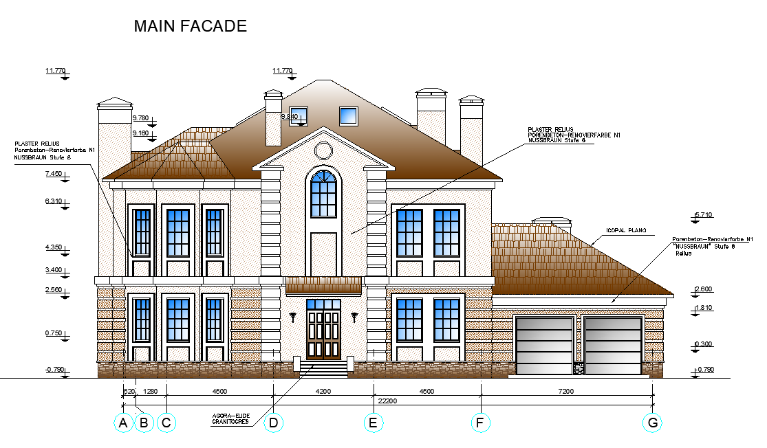 Front elevation family house plan layout file, leveling detail, centre lien plan detail, dimension detail, furniture detail in door and window detail, chimney detail, etc.