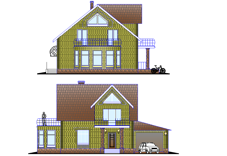 Elevation Small family house plan autocad file, front elevation detail, side elevation detail, car parking detail, furniture detail in door and window detail, column detail, light lamp detail, etc.