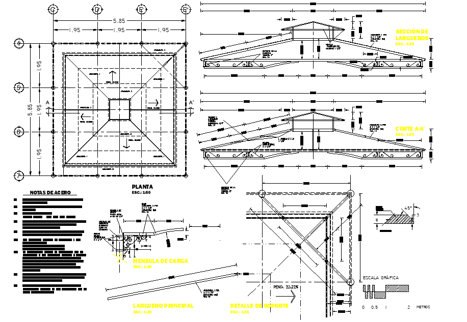 Roof plan and section plan detail dwg file, centre lien plan detail, dimension detail, naming detail, reinforcement detail, bolt nut detail, specification detail, section line detail, etc.