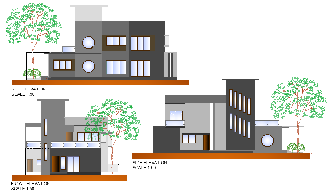 Elevation housing plan autocad file, front elevation detail, right elevation detail, left elevation detail, landscaping detail in tree and plant detail, scale 1:150 detail, furniture detail in door and window detail, column detail, etc.