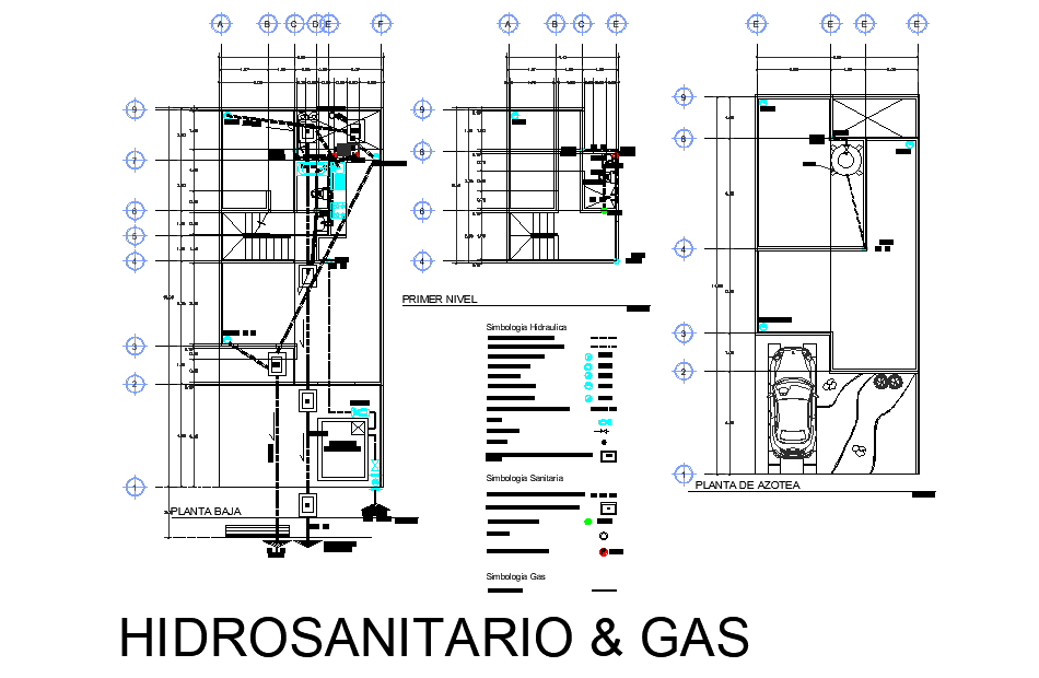 Hydro sanitary and gas plan layout file, symbol hydraulic detail, centre lien plan detail, dimension detail, naming detail, stair detail, toilet detail, etc.