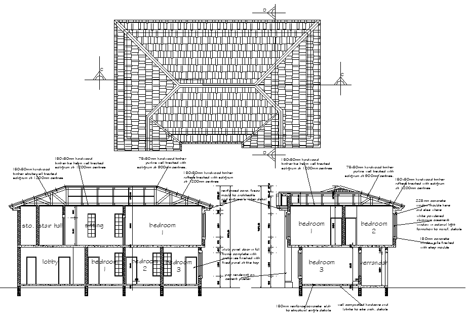 Roof plan and section plan layout file, dimension detail, naming detail, section line detail, section A-A’ detail, section B-B’ detail, furniture detail in door and window detail, roof section detail, etc.