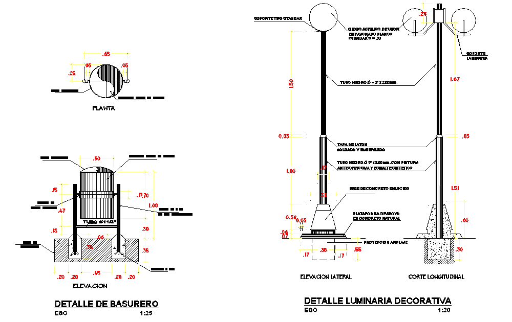 Trash and decorative luminaries detail layout file, plan and section detail, dimension detail, naming detail, concert mortar detail, section longitude detail, etc.
