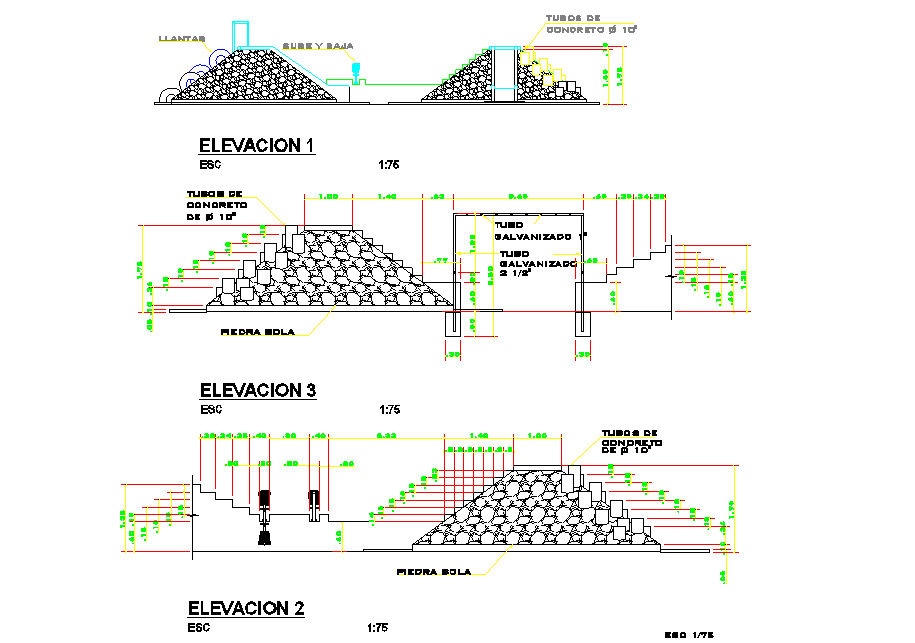 Earth rockfill dam elevation plan detail dwg file, earth detail, dimension detail, naming detail, scale 1:75 detail, etc.