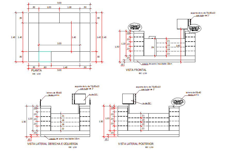Stair Plan & Elevation Design, stainless steel socket 10cm, tv stand of 70x50x10 with tube of 2 ", 65x40 sign comic text etc.