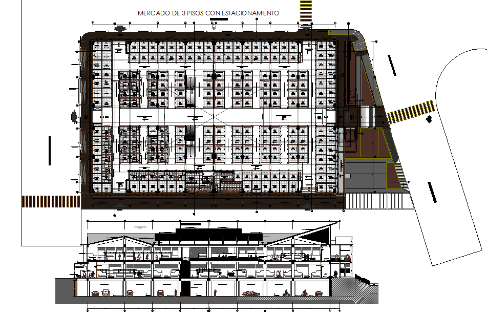 Commercial Complex Project Autocad detail. 3-story market with parking, central hall, prolong av. degree miguel, parasol projection with structuremetal coated with alucubond.