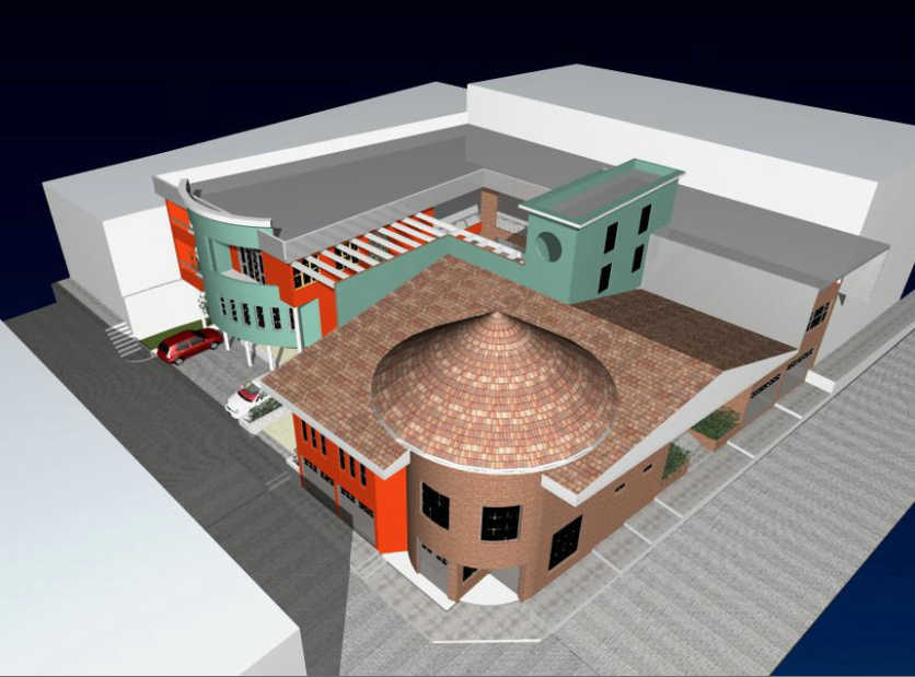 3d top view design of shopping mall that includes a detailed top view with dome view, doors and windows view, terrace view, wall design, staircases and much more of shopping mall details.