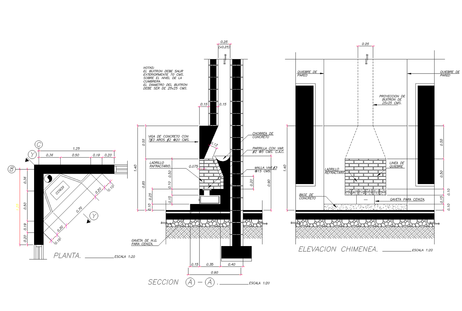 Roaster plan. Plan with elevations and sections in detail. Dimension detail, concrete beam, firebrick, dripping of concrete, ash drawer, wall break, etc.,