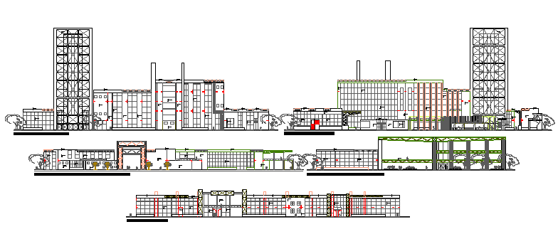 Multi-story shopping mall all sided elevation and sectional details dwg file.