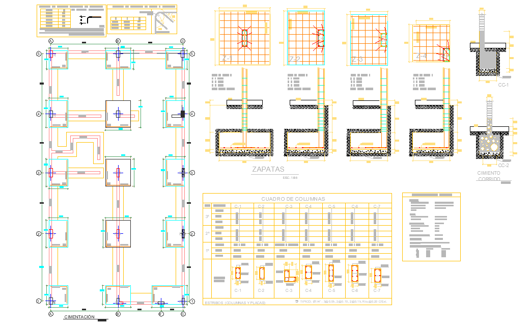 Foundation plan and section detail dwg file, centre line detail, dimension detail, naming detail, column section detail, reinforcement detail, bolt nut detail, etc.