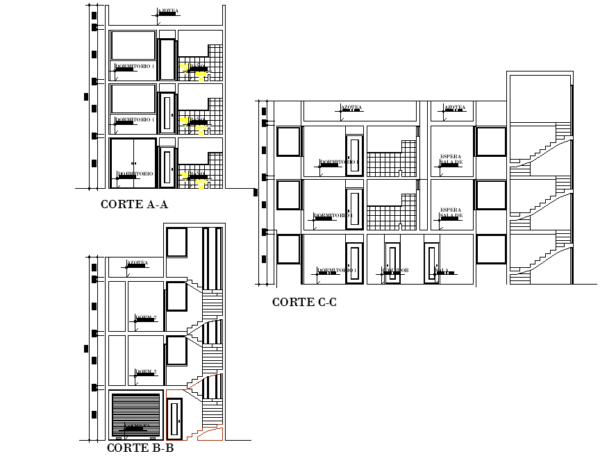 Section house family plan layout file, section A-A’ detail, section B-B’ detail, section C-C’ detail, dimension detail, leveling detail, stair detail, etc.