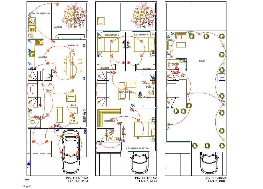 Electrical house plan detail dwg file, car parking detail, furniture detail in door, window, table, chair, sofa, bed and cub board detail, landscaping detail in tree and plant detail, etc.