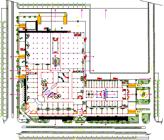 Ground floor layout plan details of mini shopping mall that includes a detailed view of indoor roads, entry gate, exit gate, mini garden, car parking view, tree view, shops and showrooms, corporate offices, toilets for males and females, corporate offices, sitting area, passage, indoors staircases and much more of mall floor plan details.