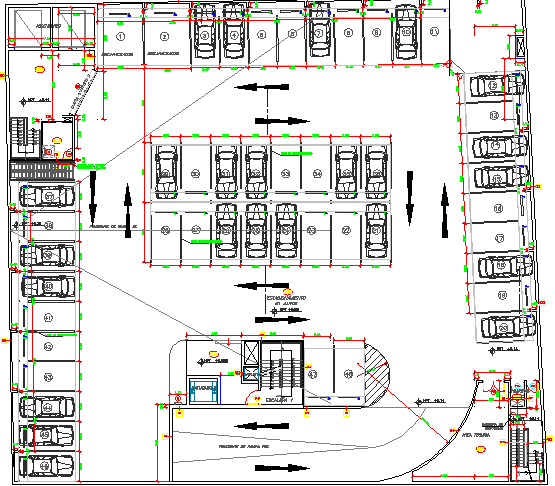 Basement with car parking floor layout details of shopping center that includes a detailed view of car ramp, entry and exit way, indoor roads, sign board, specified car parking space, staircases, elevator view and much more of shopping center details.