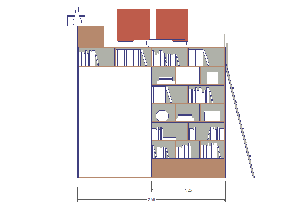 Cupboard design with furniture view dwg file in elevation with view of furniture view with cupboard base view,boxes view of cupboard,with view of different useful book putting view,designer pot view in upper side,ladle view with wall support view with important dimension.