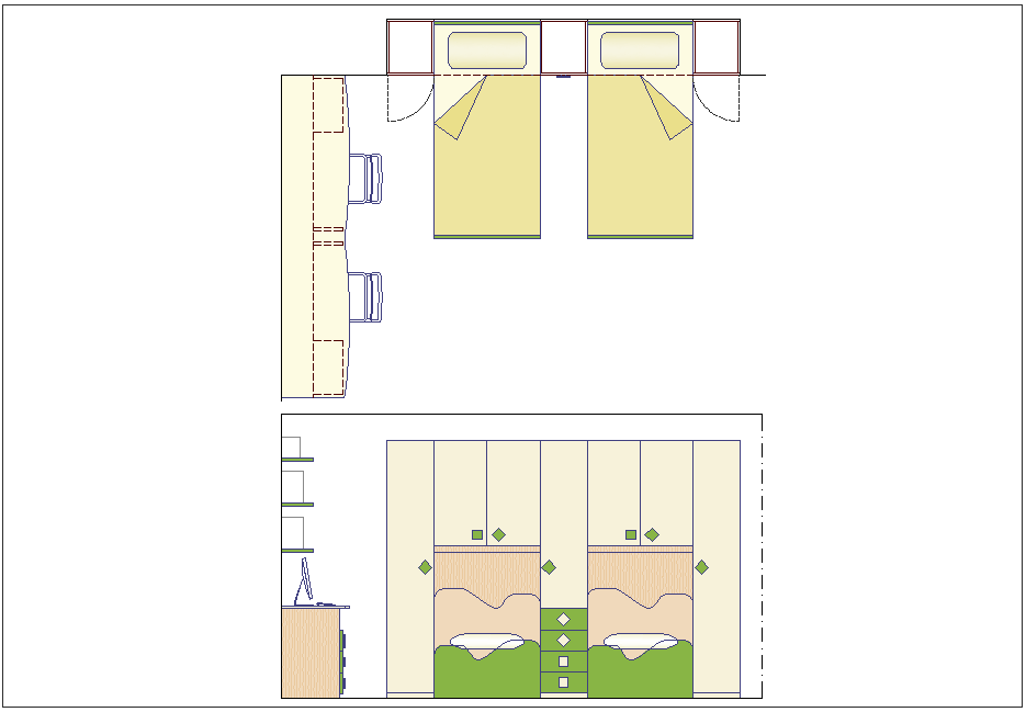 Plan and elevation of double bed with furniture view dwg file in plan with view of double bed view with it support view and double bed elevation with view of bed support and drawer view with boxes view in elevation.