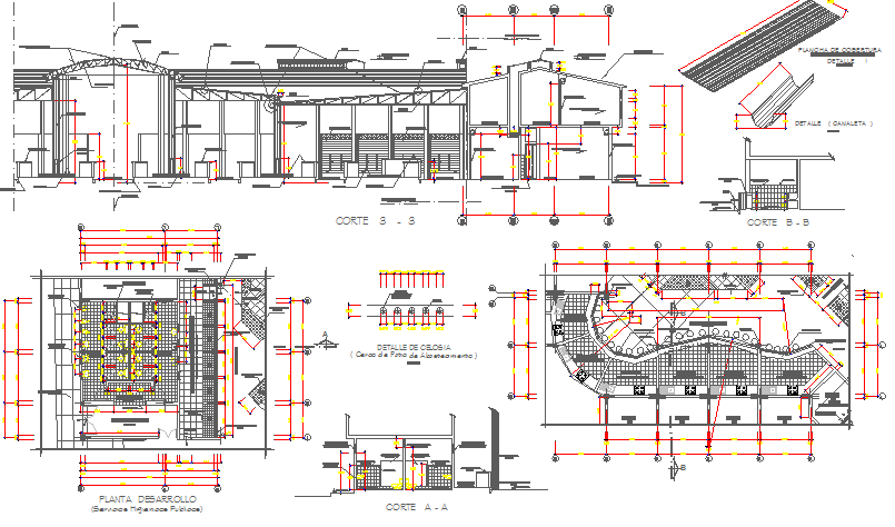 Cut sectional and construction details of mini shopping mall that includes a detailed view of cut side sectional view, sanitary installation view, measures, wall construction roof construction, dimensions and much more of shopping mall project.