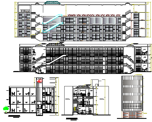 Multi-flooring shopping mall elevation and sectional details dwg file.