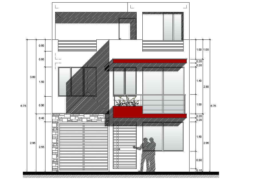 Front elevation single family home plan autocad file, dimension detail, naming detail, hatching detail, balcony detail, reeling detail, furniture detail in door and window detail, landscaping detail in tree and plant detail, etc.