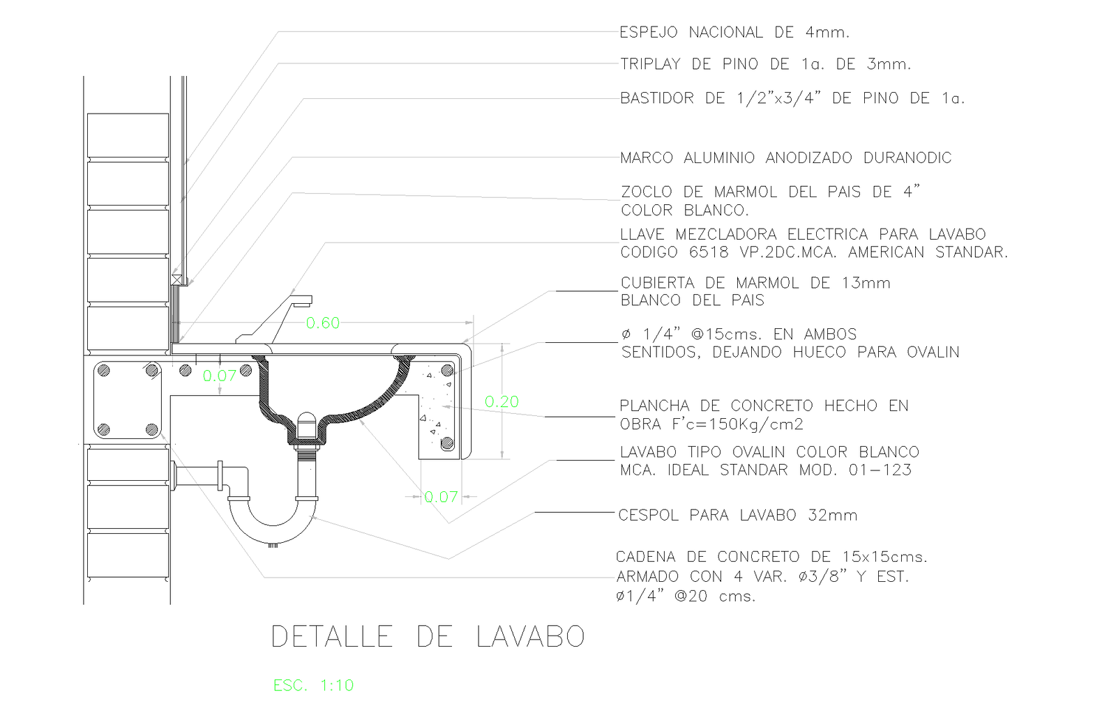 Stipend in concrete for washbasin plan. national mirror, framing detail, anodized aluminum frame detail, etc.,