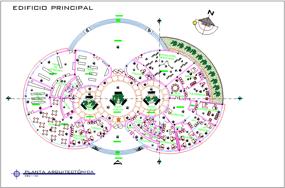 Main building plan architectural view dwg file in plan with view o circular view of area with view of