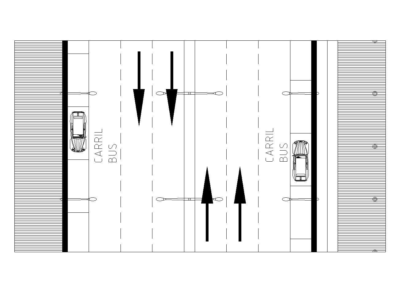 Plan of a road section. The bird eye view plan with detailing of car parking area, street lights, divider detail, etc.,