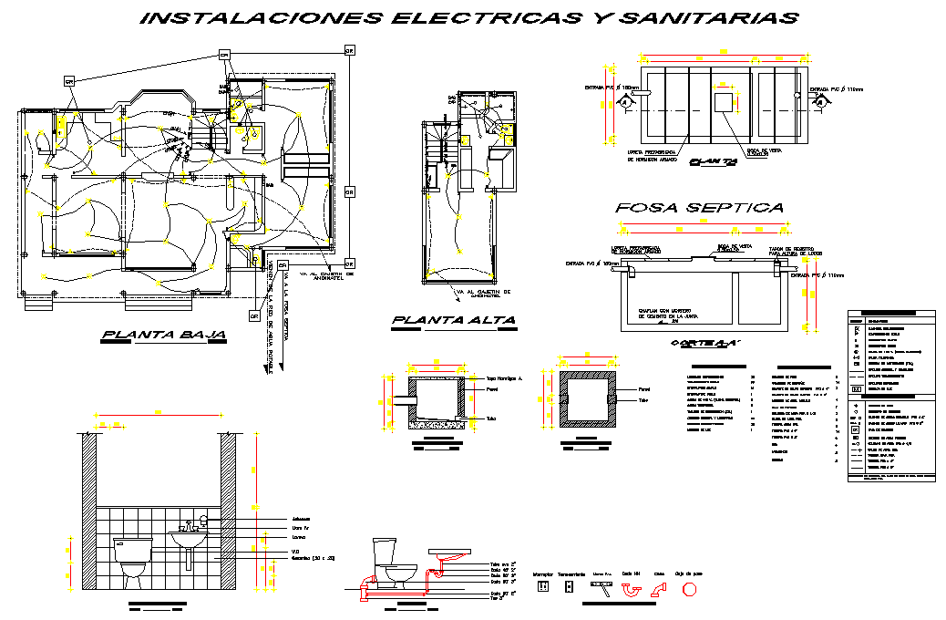 Electrical house plan autocad file, dimension detail, naming detail, toilet section detail, specification detail, main hole plan and section detail, septic tank plan and section detail, etc.
