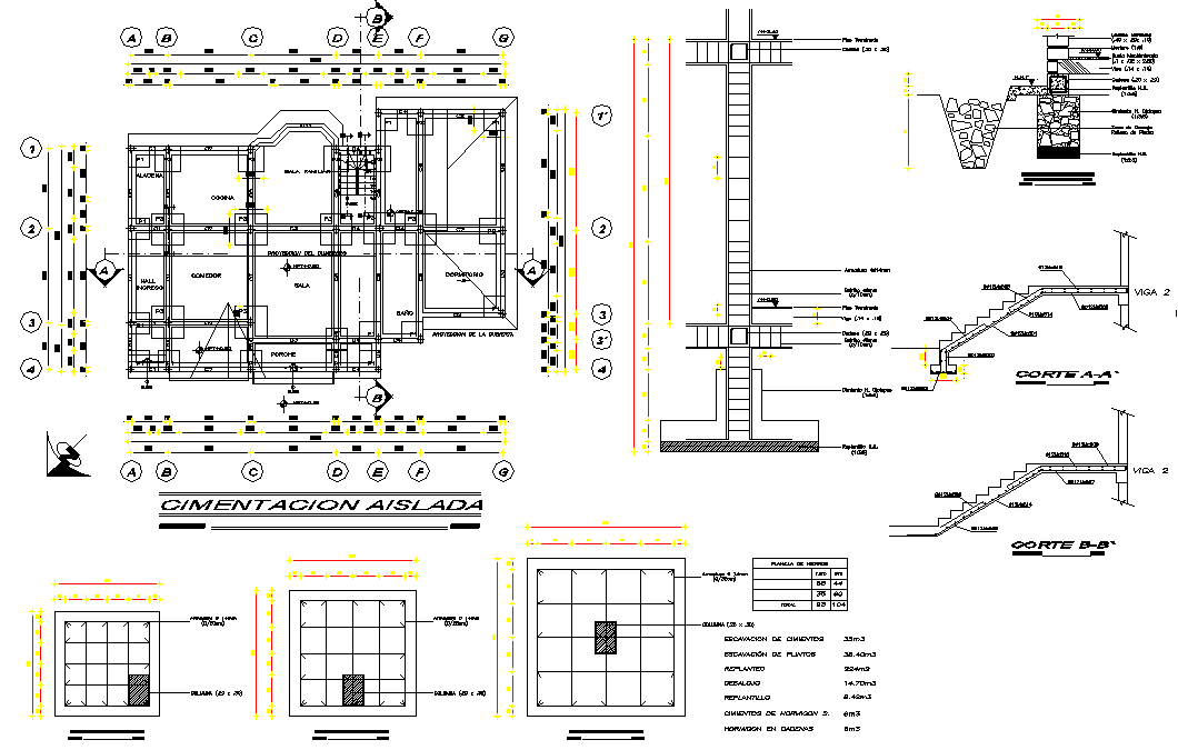 Foundation plan and section detail dwg file, reinforcement detail, bolt nut detail, stair section detail, table specification detail, etc.