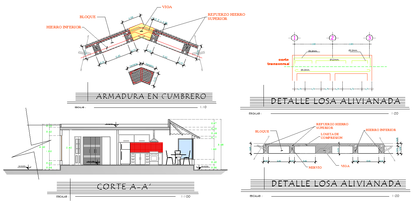 King post and house section layout file, dimension detail, naming detail, furniture detail in table, chair, cub board and drover detail, hatching detail, etc.