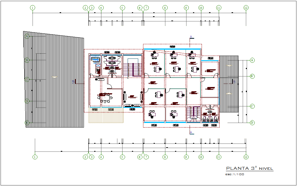 Architectural view of third floor plan of municipal building dwg file