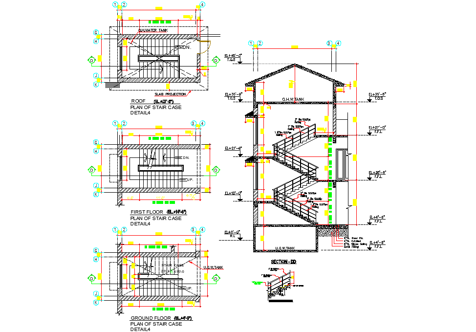 Stair plan and section detail dwg file, centre line plan detail, dimension detail, naming detail, riser and trade detail, handrail detail, leveling detail, section line detail, etc.