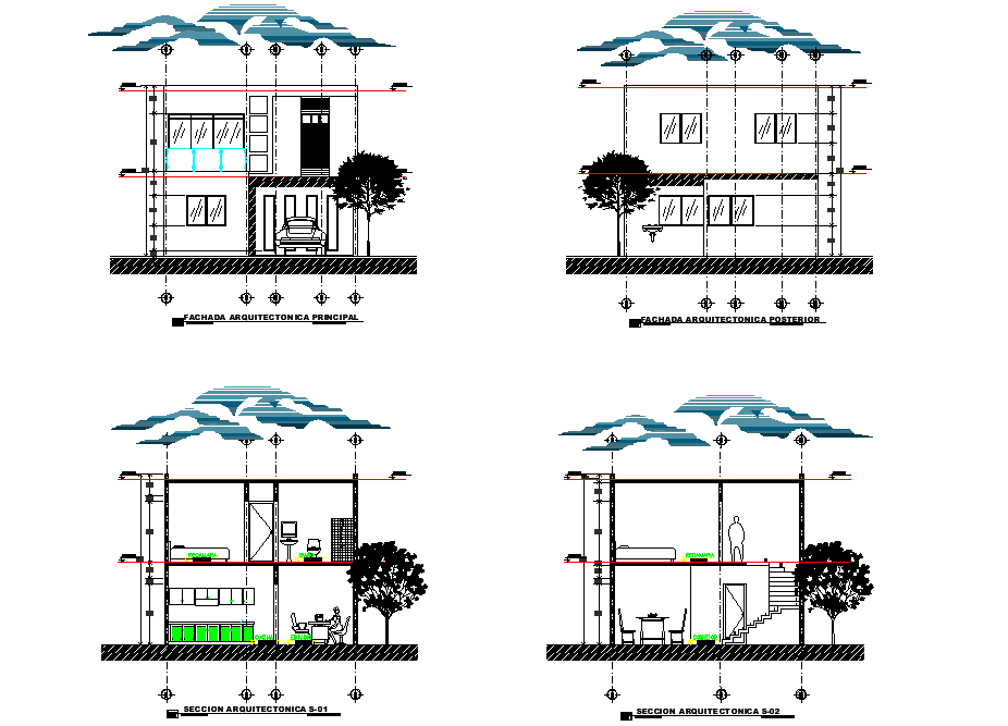 Elevation and section Living room autocad file, front elevation detail, side elevation detail, section A-A’ detail, section B-B’ detail, centre line detail, landscaping detail in tree and plant detail, furniture detail in door, window, table, chair, cub board and sofa detail, car parking detail, etc.