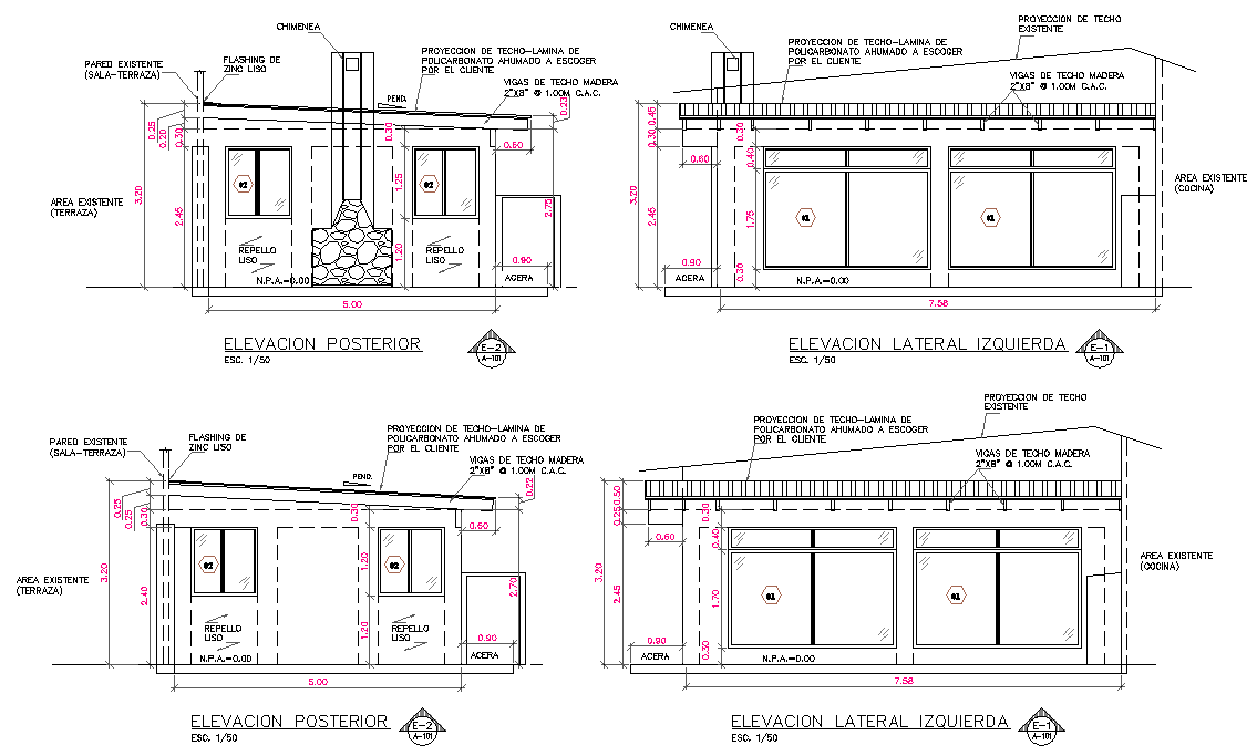 Elevation game room plan layout file, front elevation detail, left side elevation detail, right elevation detail, back elevation detail, dimension detail, naming detail, furniture detail in door and window detail, scale 1:50 detail, roof plan detail, etc.