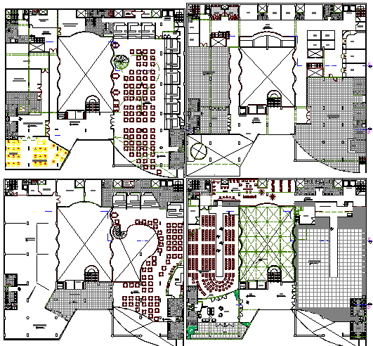 Floor layout plan details of multi-level shopping mall that includes a detailed view of ground floor, first floor, second floor, top floor with basement car parking view, main entrance, exit gate, security cabin, shops and showrooms, brand shops, retail markets, theater, kids fun zone, departmental stores, food stores, salon, corporate offices, auditorium hall, sanitary facilities, elevators and much more of floor plan details.