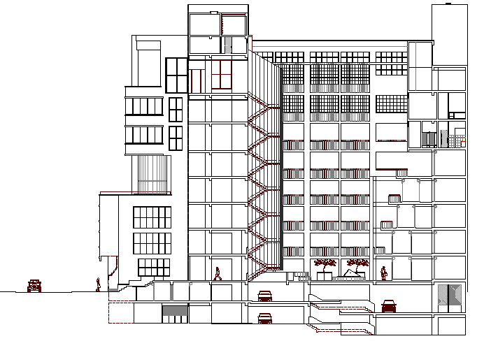 Main sectional view details of multi-level shopping mall that includes a detailed view of flooring view, doors and windows view, staircase view, roof or terrace view, car parking view, tree view, offices and much more of shopping mall sectional details.