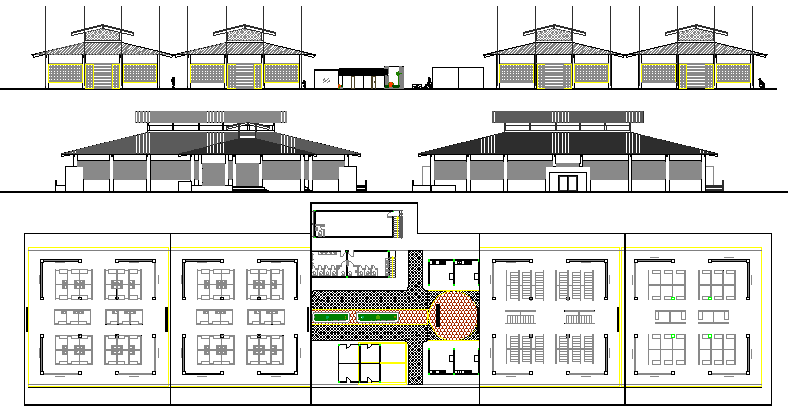 Local commercial market auto-cad details that includes a detailed view of front and back elevation view, roof view, doors and windows view, staircase view, layout plan with landscaping, green are, parking view and structure details and much more of commercial market project.